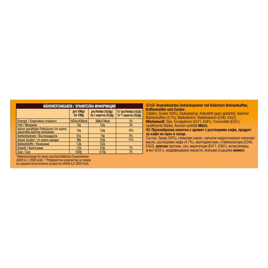 - Zutaten: Zucker (50%), Glukosesirup, Kokosfett (ganz gehärtet), löslicher Bohnenkaffee (4,7%), Maltodextrin, Stabilisatoren (E340, E452), Milcheiweiß, Salz, Emulgatoren (E471, E481), Trennmittel (E551), modifizierte Stärke, Aromen(enthält Milch)
