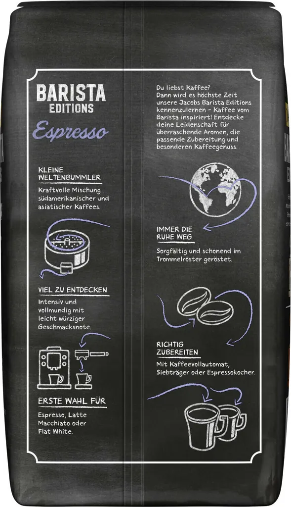 Entdecke jetzt die Jacobs Barista Editions – Kaffee vom Barista inspiriert. Du liebst Espresso, Cappuccino oder Latte Macchiato? Dann lerne unsere Jacobs Barista Editions Espresso kennen – eine kraftvolle Mischung südamerikanischer und asiatischer Kaffees. Die Bohnen werden im Trommelröster geröstet und haben einen intensiven Geschmack mit leicht würziger Note – ideal für die Zubereitung mit Kaffeevollautomat, Siebträger oder French Press
