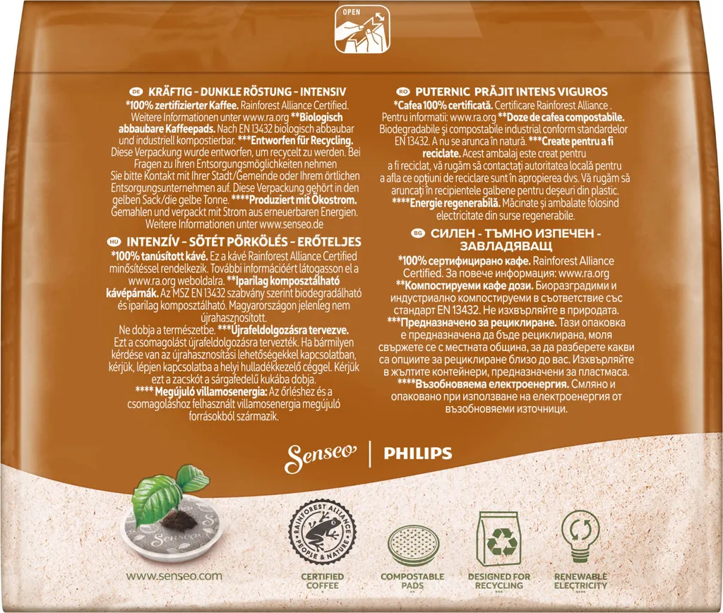 Eine Mischung aus dunkel gerösteten Arabica- und Robusta-Bohnen im extra großen Becherpad für einen starken und intensiven Kaffee mit einer sanften Crema. Entdecken Sie die SENSEO® Kaffee-Vielfalt und genießen Sie Tasse für Tasse ein aromatisches Abenteuer.